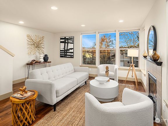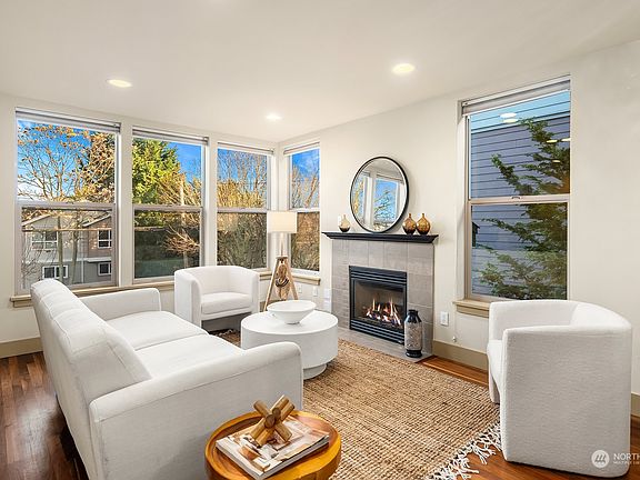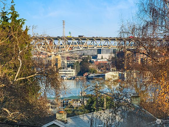 Beautifully crafted end-unit townhome w/views of Lake Union nestled on quiet street in unbeatable Wallingford location. Open-concept main floor offers sun-filled great room w/gas fireplace, flowing to spacious dining area & chef’s kitchen w/sleek flat-panel cabinetry, granite countertops & gas stove. Gorgeous hardwoods throughout the main. Upstairs, both bedrooms feature vaulted ceilings. Primary suite is a true retreat w/abundance natural light, stunning water & city views, spa-like full bath & Juliet balcony. Lower level includes 2nd en-suite bedroom w/slider to private patio & 1-car attached garage. New carpet, fresh interior wall paint & exterior paint. Steps away to Fremont, SLU, UW, tech companies, Gas Works Park & B-G Trail. No HOA!