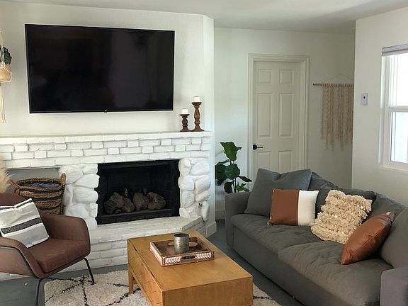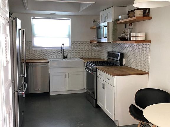 Remodeled home with concrete floors, gorgeous backyard with artificial turf, pavers, DG, covered patio and meticulously landscaped plants. The kitchen is recently updated with stainless steel KitchenAid appliances, butcher block countertops and farm sink. This home features gas fireplace, oversized bedroom, walk in closet, dual pane windows, new window coverings, and modernized bathroom. Enjoy storage in the detached garage, off street parking and free on-site laundry.