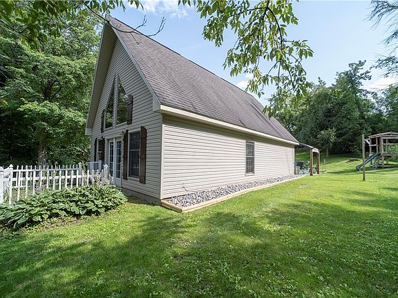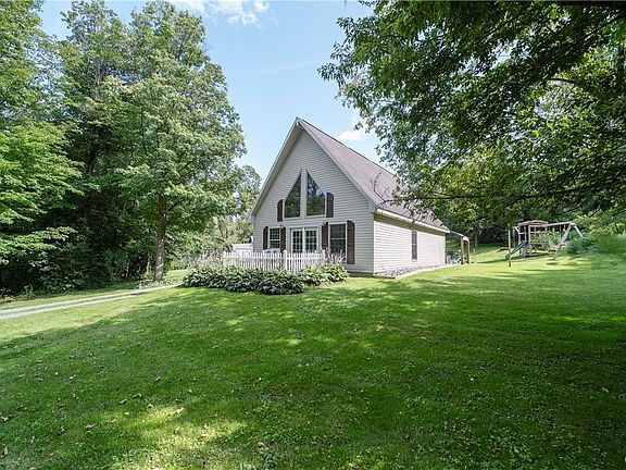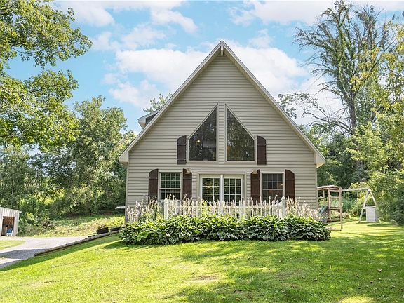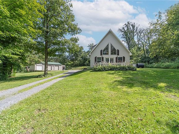 Privacy is key! Nestled back from the road is your very own lodge in the woods. This adorable A-frame style home provides a first floor bedroom and full bath along with laundry room. An updated kitchen with movable island to fit your needs. Upstairs brings another large bedroom with balcony and full bath. Set on nearly 3 acres, outside you'll find rock landscaping for easy maintenance, a stampcrete patio with pergola for relaxing and a large 4 bay garage with electricity and plenty of storage. Don't miss this beautiful property!