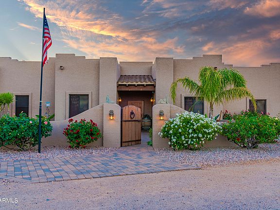 WICKENBURG LIVING AT ITS FINEST! Come and enjoy this stunning Territorial style home perfectly situated on 6.33 acres, HORSE property with mountain views! Main house is over 3,200 sq. ft, 4BD 3BA, along with a 752 sq. ft detached Casita. You'll love the cook's kitchen w/ 6 burner cooktop, pot filler, large kitchen island, plenty of pantry space, beverage center, warming drawer, etc...There are so many unique characteristics, from the custom carved front door, custom wood carved FP mantle, lovely tile work, amazing covered patios, knotty Alder doors, niches & much. SOLAR OWNED for extremely low utility costs. Guests can enjoy the detached Casita w/ kitchenette, bath, great rm/bd rm. This property is FULLY FENCED, beautifully landscaped, 100% owned well, gated entry Property features: There is an upper viewing area w/ Ramada, lower Ramada & garden area, orchard featuring multiple variety of orange, grapefruit, lemon, limes, nectarines, & apple. Storage room for tack or gardening items. A separate detached building that will make a great workshop, home is wired for generators. Two (2) generators will remain with the property. Car lift in main garage will remain as well.