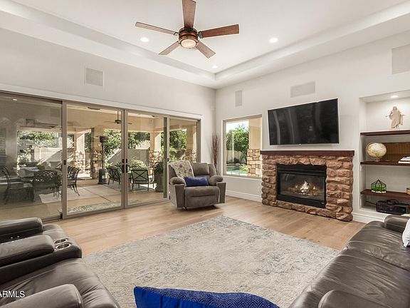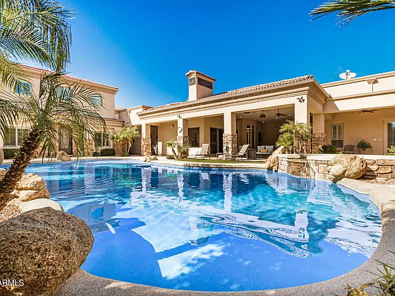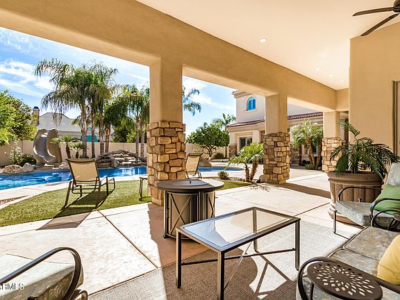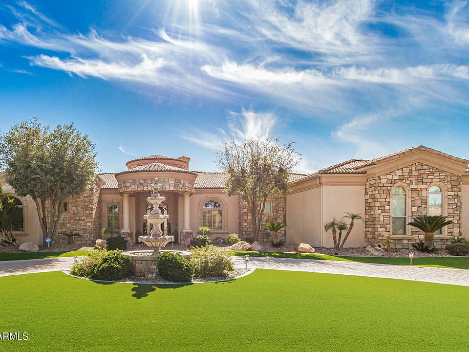 Back on market! Buyers couldn't perform!! **See 3D floorplan and Video walkthrough links** Over 200k invested in past 2 years! High-end custom home build in great area of North Mesa in the popular gated community Hermosa Groves South! Everything you've been holding out for including resort-style backyard, 55' deep RV garage, detached casita, and office/loft above RV garage! RV garage offers state-of-the-art golf simulator worth over 80k! Tons of curb appeal! New artificial grass in front yard with pavered circular drive! 12' ceilings and spray foam insulation throughout! All bedrooms are en-suite. Master suite offers large bedroom area with gas fireplace, his and hers closets, separate tub and shower, and separate bonus room currently being used as gym! New roof in 2023 over most of home! Beautiful travertine tile flooring, new wide plank engineered wood flooring in living and family room, and new plush carpet in secondary bedrooms. Amazing kitchen with new GE Monogram gas cooktop and built-in microwave, double ovens, built-in fridge, custom cabinetry, granite counters and massive walk-in pantry. Completely redesigned great room to modernize the space. 16' Anderson door was added, fireplace was moved from corner and centered on wall. 7 other Anderson windows replaced throughout the home! One of the secondary bedrooms in main home is upgraded with kitchenette! Another bedroom is huge and can be used as kids bunk room or media room and has access to outside through bathroom which also serves as pool bath! Over 1,300 sq ft covered patio area that is almost 45' feet deep offers lots of entertaining room with a TV sitting area. Misting system at back patio and built-in BBQ. Huge saltwater heated pool with water feature and baja step bubblers. In-ground spa and new slide! Separate casita with full kitchen, bedroom area, laundry, and ADA accessible shower! RV garage is air conditioned and has (2) 50 amp hookups! Even with simulator in place still room in RV garage for trailer parking. Upstairs office above RV garage is climate controlled and very large! Main house and guest house/RV garage on two separate meters! Backyard trees are watered with flood irrigation, and many mature citrus trees including grapefruit, tangelo, lemon, valencia orange, and 11 navel orange! This home is super-efficient and has everything!! Make your appointment today!