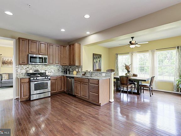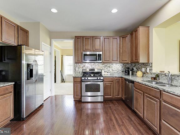 This gorgeous home, located in a lovely sidewalk-lined neighborhood, was just built in 2012 and is ready for you to simply move in and enjoy. Hardwood floors flow throughout much of the main level. The gourmet kitchen includes stainless steel appliances, granite counters, and gas range, and is open to the family room. Grab a quick weekday meal at the breakfast bar or sit down with guests for dinner in the spacious dining area, which is adorned with windows for beautiful backyard views. Enjoy peace and quiet or extend your gatherings to the outdoors on the patio which has a picturesque pond view, and cozy up to the family room fireplace in winter. Two additional rooms provide great space for a quiet living room, formal dining, home office, and more. Upstairs, the generously sized master suite is the perfect spot to retreat and relax. Two walk-in closets, double sinks, and a soaking tub complete the space. The laundry room is conveniently located upstairs. The finished basement provides additional living space or room for guests, and does have rough in plumbing for a third full bath. Enjoy the close proximity to restaurants, shopping, entertainment, and commuter routes to DC, NOVA, Andrews, Pax, and more.