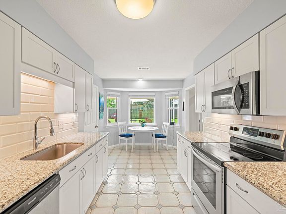Beautiful, Brick, 3 Bedroom, 2 Bath Home in Bay Cliff Estates off of South Scenic Hwy. Updated Kitchen, Bathrooms, Windows, Flooring and Landscaping. Home showcases several exterior amenities including adorable front yard flower gardens; welcoming flagstone front patio; large Florida Room overlooking the spacious backyard; an open wood deck; paver-stone back patio; corner raised bed garden; privacy fence; outside covered workout area with pull-up bars and balancing beams; and automated sprinkler system. The interior features a large family room with wood fireplace; crown molding; new LVP floors and new ceiling fans in the main living areas; 6-panel doors throughout; a family dinning room with built-in bookcase, upgraded ceiling lights; freshly painted walls; and a versatile laundry room with new washer and dryer, utility sink and organizer. The eat-in kitchen includes a breakfast nook, pantry, granite countertops, under cabinet lighting, and stainless-steel appliances, along with easy access to the formal dining room. The master suite has its own private entrance to the sun room and features a renovated bathroom that includes a walk-in shower and walk-in closet. Property updates include new roof (2023) - including vapor barrier and hurricane clips; Luxury Vinyl Plank (LVP) floors (2023); storm-rated windows (2021); storm rated kevlar door coverings (2023); oversized 6-inch gutters (2023); top notch HVAC & water heater (2019); storm rated garage door, with programable opener (2022) and key pad (2024). The property is within 10 minutes of Pensacola International Airport, Cordova Mall and numerous restaurants. It is also within 15 minutes of Downtown Pensacola and University of West Florida.