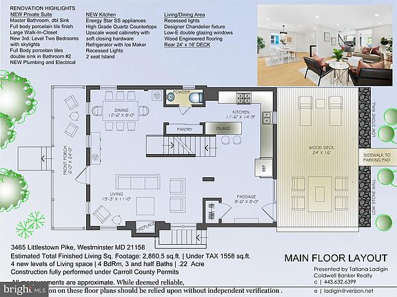 Professionally and beautifully renovated Vintage Modern Residence welcomes you: Existing structure was stripped to the bones and had received new structural, plumbing and electrical renovation performed under County Permits. Main floor designed to follow “Open Living” concept based on free movement through Living Space to Dining area, Kitchen, to an outside deck. Wood Engineered floor through whole Main floor. Situated in Silver Run subdivision and neighboring with historical The Union Mills Homestead and Recreation Area, you can take enjoyable walk on many trails, visit Recreational and Natural Centers. Your future residence located 15 min driving from Main Street with restaurants and shopping, or you will be able to have a quiet evening with grilling out on your deck. And for Golf lovers – 4 min. drive to Golf Course! 4 Living Levels have 4 Bedrooms, including Private Suite with huge Walk-In-Closet and specious Private Bath with double sink. One more Bedroom on 3rd level is large enough to have King Bed and Sitting area. There is an extra room for your Office and plenty space on Lower Level to combine Recreational and Fitting Areas. Each of above ground levels have full Bathrooms as well as Private Suite and Powder Room on Main Floor. Dining area has Chandelier, chosen by Designer. Kitchen has upscale wood cabinetry, high grade quartz countertops, porcelain backsplash and Island with pendant lights. Recessed Lights scattered through Living Area Ceiling. Exterior received new siding and recently replaced roof. All mechanical units are new and cooling provided with 2 zone AC Units. Well was inspected and water tested by Professional Water Inspector. Septic tank was cleaned after construction. All Invoices can be provided upon requests.