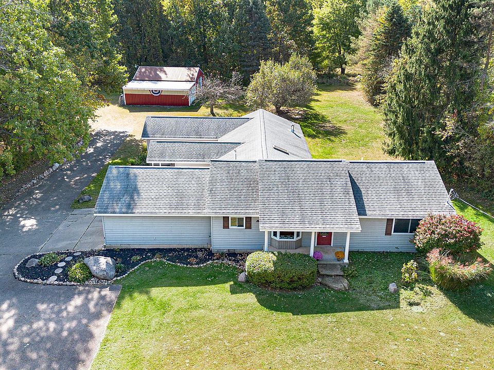 This 4-bedroom, 3-bathroom home offers almost 2600 square feet of comfortable living space on a generous 1.2-acre lot. Step inside to discover a welcoming open floor plan, with a living room, dining room, and open concept kitchen at the front of the home, and a spacious family room featuring tall, vaulted ceilings and a cozy wood burning stove—perfect for those chilly evenings—at the back of the home. The split floor plan provides a private retreat for the primary suite or a potential in-law suite, which includes his and her closets & an ensuite bath. The three additional bedrooms offer ample space for family or guests, and the main floor laundry adds a practical touch to daily living. Outside, you’ll find a spacious, tree-lined yard with endless possibilities, along with a 30x20 pole barn that has electric and an attached enclosed lean-to for added storage or workshop space. This home perfectly combines indoor comfort that's perfect for entertaining with loads of outdoor potential. 3 apple trees & 1 pear tree with plenty of room for a garden as well. Propane fuels furnace & hot water heater only. Call for a tour today!