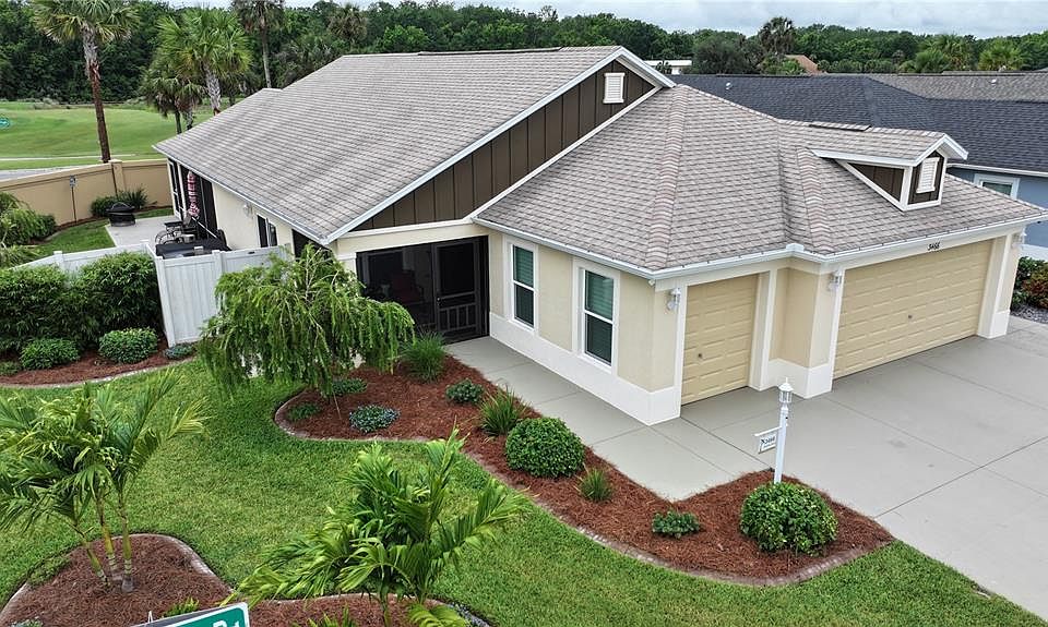 3466 Smedley Road, The Villages, FL 32163. Beautiful 3-Year-Old, 3 Bed/2 Bath/2.5 Car Garage with a 3-Car wide Driveway, and a fully fenced rear yard. Low bond balance. Very private corner lot with only a single neighbor, across from and walking distance to Red and Grey Fox Golf Courses located in the highly sought-after Hammock of Fenney/Eastport Area. This meticulously maintained property boasts extensive upgrades and thoughtful features that offer both elegance and practicality throughout. Upgraded front entry offers a screened lanai, storm door with ventilation, front door side light has been upgraded with an opaque window insert for added privacy, and a unique compass rose embedded on the front porch wall (featuring the actual GPS coordinates of the home). Interior Enhancements include Plantation shutters throughout and vertical blinds on patio doors, under-cabinet lighting in kitchen, remote-controlled ceiling fans with lighting in all interior rooms, upgraded Samsung kitchen appliances (2022) including refrigerator, microwave, oven, and a whisper-quiet dishwasher, spa-like shower heads added in both bathrooms, and laundry room cabinetry has been added for additional interior storage. In garage, smart storage Solutions have been added, such as pull-down attic stairs with additional flooring in attic for storage above the garage, black built-in storage cabinets and two additional shelves in garage convey with the home. The garage also features professionally fully insulated garage doors, epoxy-coated garage floor for durability and easy cleaning, and a NOVA water treatment and softener system. On the exterior all the concrete has been updated with sealer and stained, a 110-volt plug-and-play hot tub (includes all tools/supplies) is included, two rear exterior lights added for visibility and ambiance, 6-inch rain gutters installed around the entire home, additional deadbolts and security locks have been added, an optional glass panel dog door in the living room slider (can be removed if not needed), large rear lanai with dog door into yard built-in, and extra electrical plugs added for convenience. In addition, the lot has been beautifully landscaped with plants and concrete border trim. Don’t miss your chance to own this beautifully upgraded and well-maintained home in the heart of The Villages! Whether you’re searching for your forever home or a seasonal retreat, 3466 Smedley Road is available now and ready for you. Schedule your private showing today! This home won’t last long—contact your agent now!