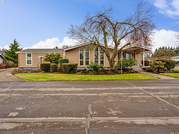 Own your own land & experience the serenity at Staffordshire's gated 55+ community. This delightful home boasts ample storage space, back patio with a front covered deck. Interior is bathed in natural light thanks to solar tubes & numerous windows, while a built-in dining cabinet adds an extra touch of elegance. HOA $210 per month that covers water, septic, garbage, basic cable, pool/hot tub, and maintenance of common areas. Boat/RV storage if available w/fee. Nestled on the outskirts of Eugene.