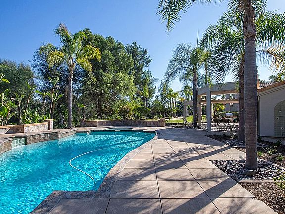 Incredible Olivenhain estate with direct access to the equestrian trail system. This wonderful property is situated on two acres with exquisite grounds. The home is a single-level masterpiece with 6 bedrooms, plus office (or 7th bedroom), and 6 baths. Vaulted ceilings and skylights fill the home with natural light. The kitchen is beautiful with gas cook-top, dual ovens, wine fridge, built-in fridge, prep sink. The kitchen opens to the huge family room which features a beautiful fireplace and opens to the awesome back yard. There is a temperature controlled wine room off the family room with 1000+ bottle capacity. The master suite is on the south end of the home and is architecturally stunning with pitched ceilings and visible ceiling beams. The master features a separate massage/exercise room, fireplace, his & hers walk-in closets and a 3rd utility closet, as well as a spa quality bath. There is direct access to the back yard from the master and a private patio with views of the grounds. There is a second master suite on the opposite end of the home that could easily function as a granny flat. Outside is a peaceful paradise with an outdoor fireplace and covered patio area, outdoor kitchen, and sparkling pool and spa. The lower part of the yard features the tennis court, 1/2 basketball court, chipping and putting green and huge kids playground area in addition to room for horses.