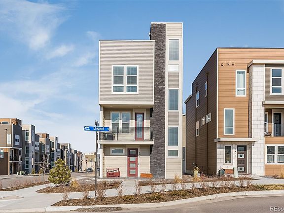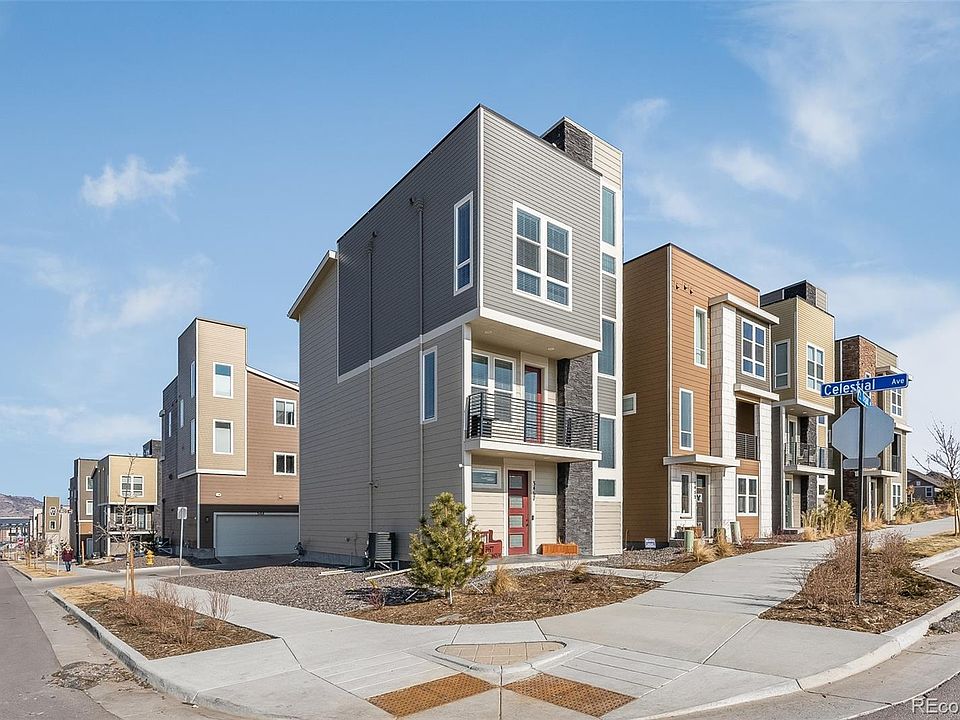 This gorgeous, south facing, corner lot, Cityscapes home is just 18 months new!! Featuring Stunning mountain views from the beautiful rooftop deck and balcony as well as upgraded finishes throughout the home!! The gourmet kitchen offers granite countertops, a five burner gas cooktop, SS appliances including a double oven, dishwasher, microwave in walk in pantry, black SS refrigerator, 42" cabinets with crown molding, a big kitchen island with seating, upgraded 36" designer stainless hood, new antique gooseneck kitchen faucet and glass subway tile backsplash! The dining room features a built in seating area and the living room has balcony access with amazing views of the mountains and the park! The spacious master suite offers great views and features the deluxe master bathroom with double vanity, walk in Euroglass shower with dual shower heads, granite countertops, LVT flooring and a huge walk in closet! Soft close cabinets and drawers throughout home! Ceiling fan prewires in all bedrooms and family room, bedroom lighting already installed, huge crawl space for storage in garage with radon mitigation system installed, home technology package with outdoor speakers on rooftop deck, surround sound in family room and speakers in master bedroom! The massive rooftop deck also features a gas line for a grill and Aura deck tiles! Secondary bedroom offers an en suite bathroom with LVT floors and corian countertops. Entry level has large storage room that has the ability to be a fourth bathroom. Upgraded carpeting and pad throughout as well and LVT flooring in entry, main level except bedroom, and all bathrooms! Don't miss this gorgeous, move in ready home! Easy access to I-25, restaurants, CR Hospital, pool, parks and schools!