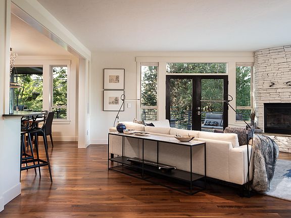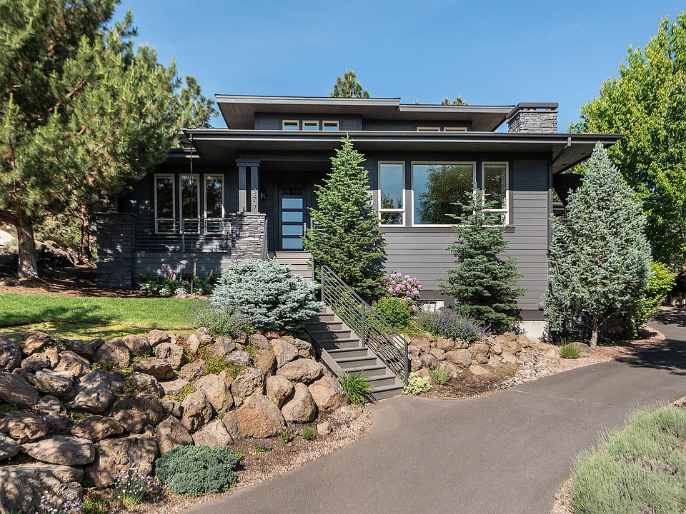 Extensively remodeled in 2022, this Awbrey Park home exudes contemporary sophistication. The unified aesthetic between form & function begins in the foyer's detailed craftsmanship in the walnut flooring highlighted by natural light & vaulted ceilings. The open floor plan provides sweeping views of the Ochoco Mountains & colorful treetops. Kitchen greats Miele, Bosch & Dacor take center stage in the sleek kitchen. The dining room features one of many designer light fixtures. Enjoy a cocktail or conversation in the lounge before retiring to the spacious primary suite with a luxury bath and deck access. Also on the main floor is an inviting en suite bedroom & office. Upstairs, 2 ample bedrooms share a full bath. Gorgeous hickory flooring extends to the bonus room with even better views & space to unwind, play or create. Integrated technology extends to even the 3-car garage. Awbrey Park offers a park, playground & access to the Deschutes River Trail. Complete furniture package for sale!