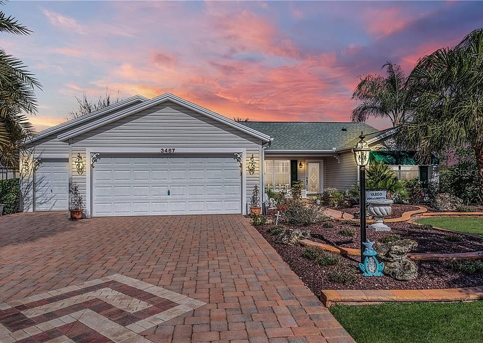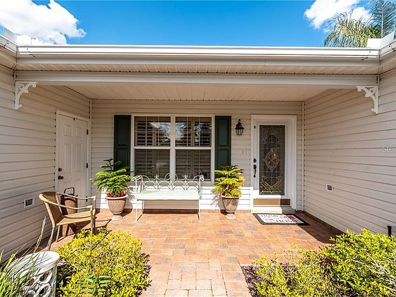 BOND PAID! GOLF & WATER FRONT VIEW! ROOM FOR A POOL! Gorgeous landscaping featuring towering palms, stacked stone, rocks in the flowerbeds, front porch, and a long brick paver driveway greet you upon arrival. Gorgeous hardwood flooring is located throughout the entire home, except for the bathrooms and laundry room. Ceramic tile is in both bathrooms. The updated kitchen features antiqued cabinetry, solid surface countertops, and stainless steel appliances including a French door style refrigerator. The master bedroom and master bathroom has been extended by several feet. In the master bathroom there are dual vanities, separate bathtub and shower, upgraded faucets, and framed mirrors. In the guest bath there is a glassed in shower, hard surface countertops, framed mirror, and solar tube. Volume ceilings, framed windows, plantation shutters, elegant trim work, crown molding, and the professionally painted interior add a lot of pizzazz. In the rear of the home there is a Florida Room and a glass enclosed lanai. This area leads to a stamped concrete birdcage that is partially under aluminum cover. Gorgeous flagstone, towering palm trees, and privacy landscaping adorns the backyard. If you have ever dreamed of having your own pool there is plenty of room. A new roof was installed in 2019 and a new AC installed in 2017. The laundry room features additional cabinetry, top-of-the-line Maytag washer and dryer, solar tube and utility sink. The two car plus golf cart garage has been extended two feet forward. There is a lot additional cabinetry in the garage. For additional storage there is an attic with pulldown stairs. There are not many homes like this in the community. This is your chance on a little slice of paradise!
