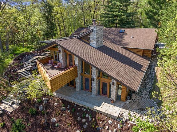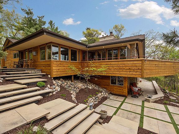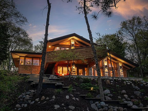 Captivating Frank Lloyd Wright inspired Kimble Lake home in premier Crosslake location. This architectural masterpiece was designed by Tom Olson who studied under Frank Lloyd Wright. Boasting panoramic lake views, southern exposure, perfect sand beach, high end stainless appliances in the chefs kitchen, luxurious master suite with spa-like bath, professional landscaping, four bedrooms, five baths, & spacious guest suite above the detached garage. The In-floor heat will warm your toes as you spend time next to one of four fireplaces and gaze out your floor to ceiling windows admiring northern Minnesota's tranquil serenity. This home is truly a waterfront oasis.