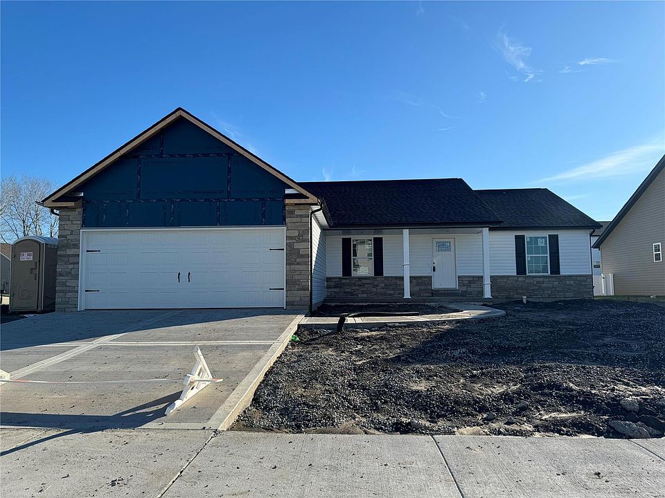 Ahhhh nothing better than the smell of NEW! This new construction ranch boasts 1,641 sq. ft. of stylish living on a desirable corner lot located in Indian Springs. Featuring an elegant stone front, this residence offers a spacious 2-car garage w/18 ft doors (normally 16 ft) for easy access. Step inside the foyer to discover a split bedroom concept that enhances privacy, along w/a vaulted living room & exit door to outside patio. The eat-in kitchen is perfect for casual dining. Retreat to the primary suite, complete w/MSTR bath featuring a double sink, walk-in shower, and a generous closet. An extra-large laundry room offers versatility—ideal for a small office or additional storage w/space for a second refrigerator or freezer. The unfinished basement provides limitless possibilities, featuring an egress window for a future 4th bedroom & plumbing ready for a bath. Don't miss your chance to make this beautiful home yours—perfect starter home or to downsize. Home is ready for YOU!
