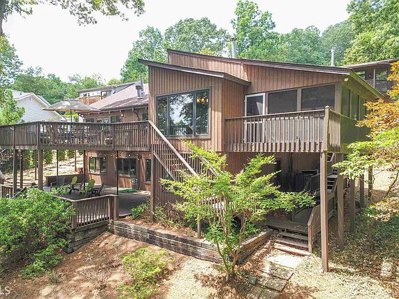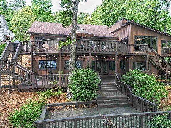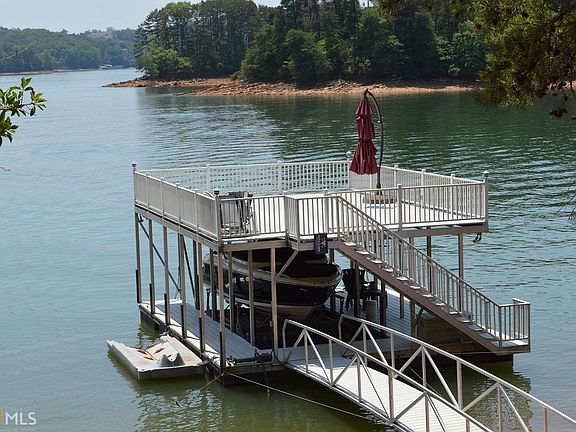 Glorious, unforgettable big-water views of Lake Lanier fm this one-of-a-kind lakefront home. Beautifully updated, designed to show off the lake. Beamed vaulted ceilings, hardwood flrs, stainless appliances, granite ctrs, stone fireplace, mammoth decks, move-in ready. Light, airy, but warm & welcoming. Spacious owner suite on main floor. 3BRs, 2BAs + fam rm w/ bar on terrace level (could be in-law suite). Short walk to newer composite party dock in drought-proof water. Massive room above garage w/ kitchenette/bar, bathroom & open room (great for office or getaway space).