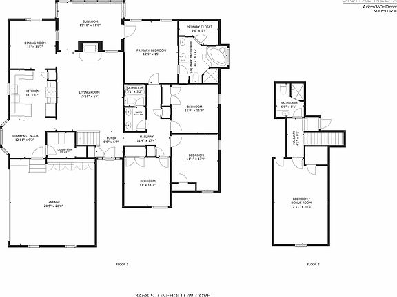 SEE 3D VIRTUAL TOUR FOR FULL HOME DETAILS! 3468 Stonehollow Cove is a recently updated 1.5-story brick home in the Stoneridge Subdivision of Bartlett, TN. The home is located just a short walk from Stoneridge Park and offers 5 bedrooms (or 4 bedrooms with a flexible bonus room), 3 full baths, and a bright sunroom perfect for relaxing.