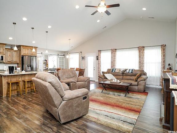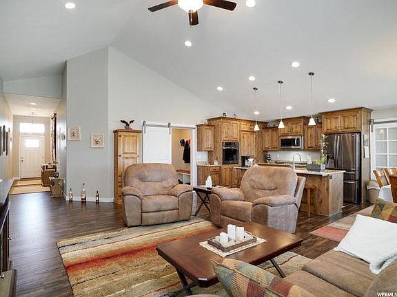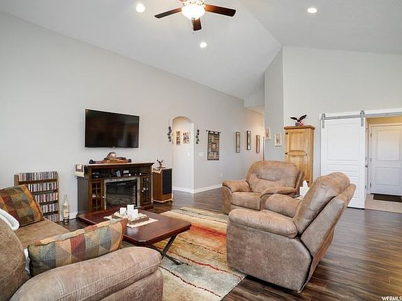 Picture Perfect in this Single Level Living home featuring easy-care upgraded laminate flooring / vaulted ceiling in great room, spacious kitchen with upgraded cabinets / granite counters / convection wall oven / desirable 36" 5-burner gas range / large walk-in pantry / SS appliances, stylish barn-door into office and also to mud room, decorative archways, large windows for lots of natural light, master suite with trey ceiling / dual sinks in master bath / extra large no-step entry shower / walk-in closet. Extended concrete covered patio w/roll-down shade, extra length 4-car garage with custom epoxy floor. Call to show / access code.