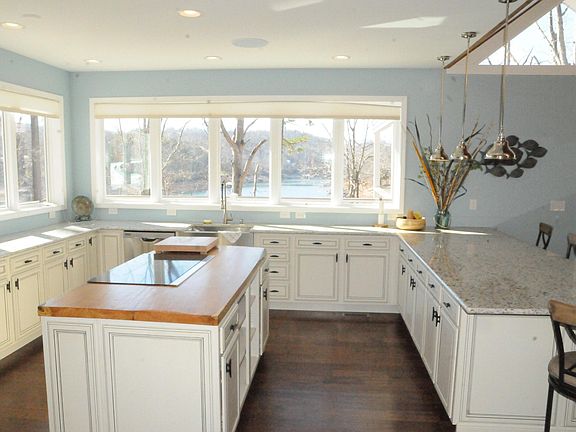Custom built with a custom bar, 2 master bedrooms w/ tile showers . 2 bedrooms with custom Bunk beds(with 2 queen & 2 single beds in each) 2380 sqft of Covered deck with a fireplace & TV mounts. Built on the 1044 for easy access to your private dock. Incredible unobstructed water views from every room. 52'' x 14ft solid slab of oak island,Composite decks, granite, completely maintenance free exterior . Pictured house next door is Similar to the one being constructed but different.