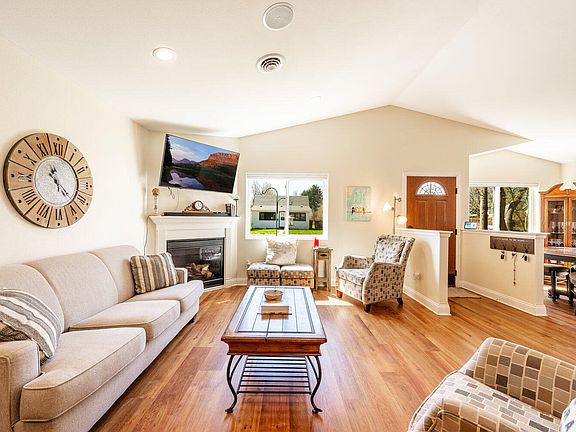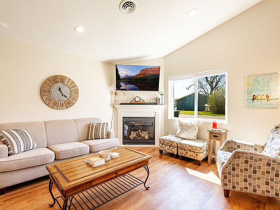 Charming, move-in ready home just minutes from downtown Sheridan! This single-level gem features zero-step entry, an open layout with cathedral ceilings, a cozy gas fireplace, and an updated kitchen with new countertops and appliances. The spacious owner's suite includes two walk-in closets and a tiled walk-in shower. Enjoy a private, fenced backyard, fresh paint and flooring throughout, built-in speakers, and a dedicated media closet—ideal for your home entertainment setup. Thoughtfully improved and ready to impress!