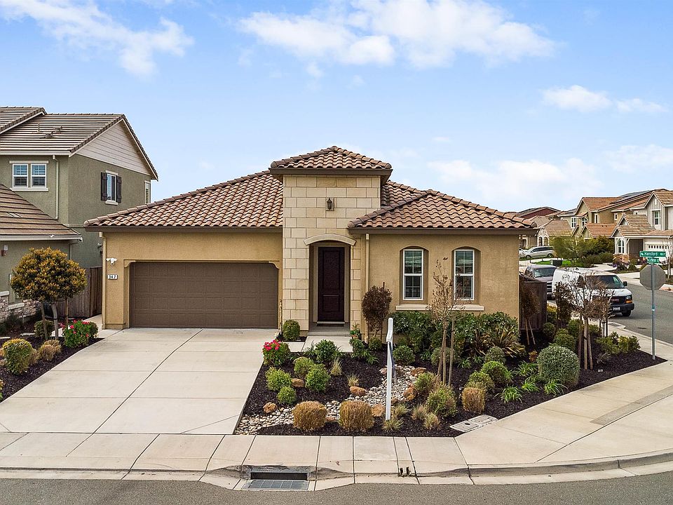 Former elegant model home with all model furnishings also negotiable! The Builder spared no expense on upgrades for this single-story, 3 bedroom, 2.5 bath home on a corner lot in Emerson Ranch. Boasting 10-foot ceilings and 8ft doors, exquisite lighting features, wainscoting, crown molding and hardwood floors, this home has it all. Enjoy the built-in office space, custom shuttered windows, Automatic shades in the living room and primary suite. Premium stereo system throughout the home. The gourmet kitchen is enhanced with new pendant lights, granite counters, espresso cabinets, water filtration system and so much more! Primary suite features coffered ceilings, serene views of your backyard, a luxurious bathroom with sophisticated floor-to-ceiling tiles. Step outside to your tranquil backyard filled with lush greenery, ideal for relaxation. Located directly across from the Emerson Ranch Park with water features, baseball diamond, basketball court, BBQ’s and pergola party spaces, perfect for entertaining. This home is a true masterpiece in an unbeatable location!