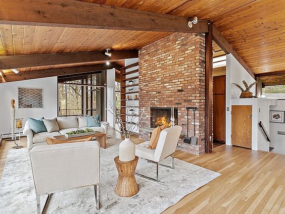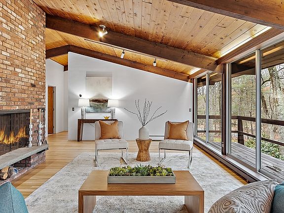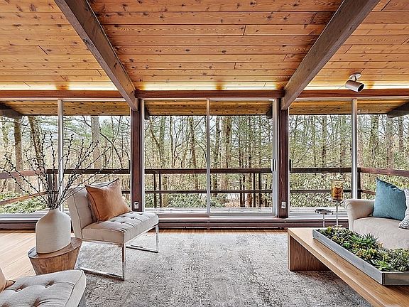 Light and bright this beautifully sited custom Deck House immediately welcomes you into the main living level. Soaring ceilings and walls of double paned windows bring year round nature views into this sleek mid-century home complementing its mahogany millwork, Douglas fir beams, newly refinished oak floors & freshly painted interior enveloping the house's many features. Floor-to-ceiling fireplace graces the living room w/sliders to deck. Kitchen is well-equipped w/SS appliances and adjacent dining room opens to a fabulous screen porch for easy summer entertaining. Relaxing primary BR w/double closets, home office/den and full bath complete this level. Steps down offers brand new luxury floors throughout a fireplaced family room w/sliders outside, 3 family BRs, a full bath and laundry/utility area. Detached garage offers storage or workshop space. Wonderfully peaceful and private w/mature trees, flowering bushes & relaxing firepit in a welcoming neighborhood close to Concord & Acton.