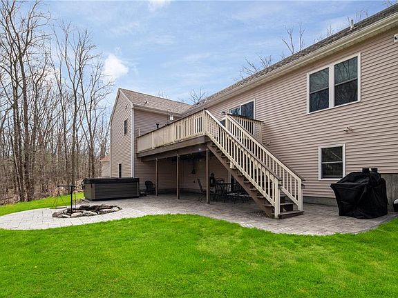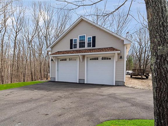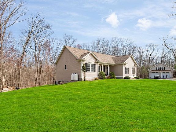 Looking for a home with extra garage space? Come check out this meticulous 10 yr. young home with garage space for 6 vehicles! This ranch has central air, an open floor plan with vaulted ceilings, hardwood floors, granite kitchen with island and stainless appliances. The primary suite has a two-sink bath with shower stall, walk-in closet and an extra closet. The two other bedrooms and bath are located on the other side of the home. Sliders in the dining area open to a deck that overlooks the wooded 3 acres. The lower level was recently finished with a game room, theatre room, and utility/storage room. Sliders walk out to a beautiful, private patio area with fire pit and hot tub. There's an attached two car garage as well. The newer detached garage has two 10' overhead doors, it's own 200A metered service, and car lift! The pave drive has space for plenty of cars, and the lawn has irrigation. This just may be the one you've been looking for!