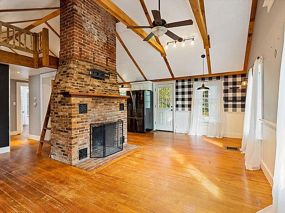 Brick fireplaceSpacious backyardBeautiful wood floorsMultiple fruit trees