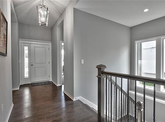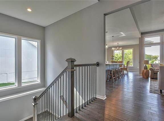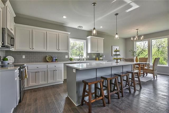 Ashland Plan built by Prieb Homes. Large open floor plan. Back of the home is wall of windows that back trees. Amazing flat backyard with no home behind. Stone Fireplace, large kitchen island. Walk in pantry with window for natural light. Nice size deck on back. Master bath with walk in shower, tub, raised vanities and walk in closet. Laundry room connects with the closet of master. Finished basement with large open space and bedroom with bath. City trail is located directly behind the home and takes you right to Prairie Center Park. NEW Lake Olathe just down the street. Home is ready.