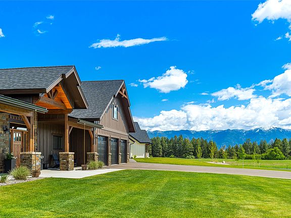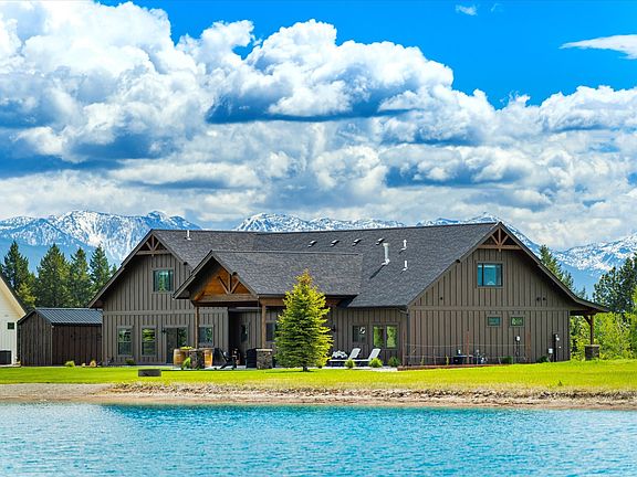 Waterfront home in Kalispell's prestigious Rosewater subdivision. Motivated seller. This 4-bed, 4-bath custom home features spectacular mountain views with room to build Detached Garage/Shop or Guest House. Custom Alder cabinetry, finishes and granite throughout. The main level primary showcases lake and mountain views with an adjacent second bathroom and flex room/office or 5th bedroom. The main level guest suite features kitchenette, adjacent bathroom, and lakeside patio access. Main level includes laundry and walk-in pantry. Upstairs find two bedrooms, a full bath, a large second family/game room and bonus flex room. Expansive outdoor living features covered front and back porches. A private beach, dock, and boat lift complete the waterfront experience. The oversized, heated, 3-car garage is complimented by additional parking. Low maintenance landscaping an in-ground sprinkler system. Enjoy Stand-up-paddleboarding, Kayaking, Swimming & Water Sports on two private lakes.