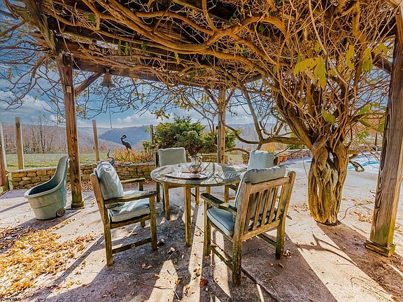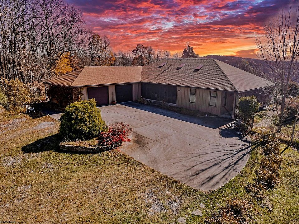AWESOME VIEWS! Custom built home inspired by the organic designs of Frank Lloyd Wright offers an open floor plan with pocket doors, providing the option for privacy from room to room. Entire backside of house offers amazing canyon views and direct patio access from the primary bedroom, gathering, dining, and living room. Away from it all, yet only a few miles from I-68 and 30 minutes from Morgantown. Surrounded by the woods and a mature fruit orchard, along with raised beds for vegetable gardening. Expansive patio with an in-ground pool and a 5 mile view to Masontown! Lower level offers guest quarters and is plumbed for a kitchen. Morton shed house offers additional play space or storage space.