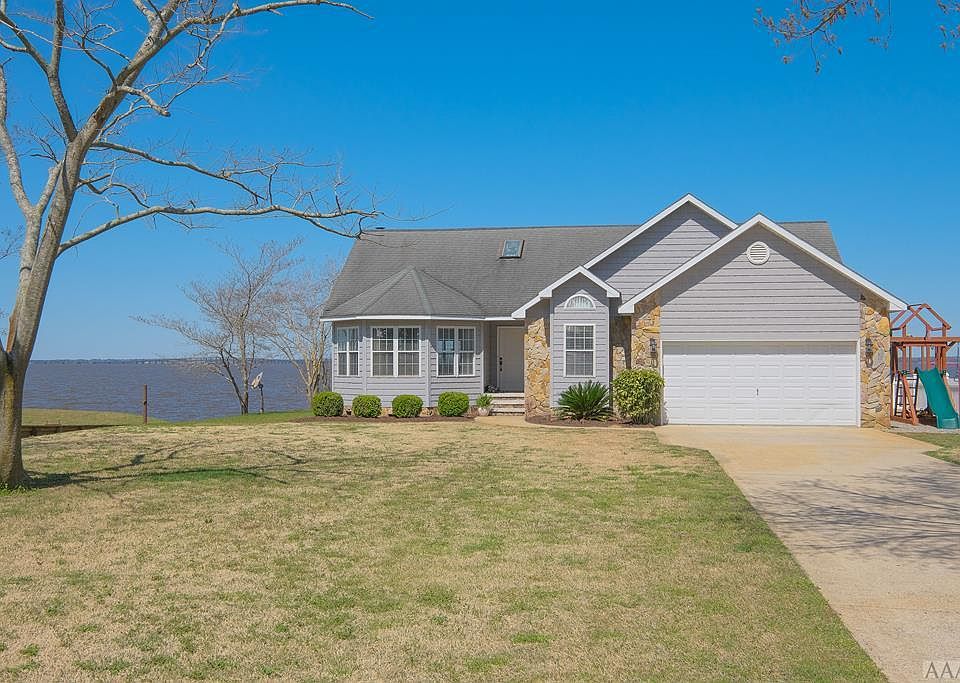 This soundfront home is as good as it gets for an affordable waterfront home or perfect little getaway in quiet Blair Shores! Open the door to a stunning great room with INCREDIBLE views of the Albemarle Sound! This open floor plan, single level home is perfectly designed for the good life both inside and out. A spacious sunroom boasts beautiful sunrises and sunsets and a huge waterfront deck has an outdoor kitchen adjacent. A pier with a 10K pound boat lift and boathouse is in place and the attached garage is ideal for storing water toys. The community boat ramp is a wonderful asset!