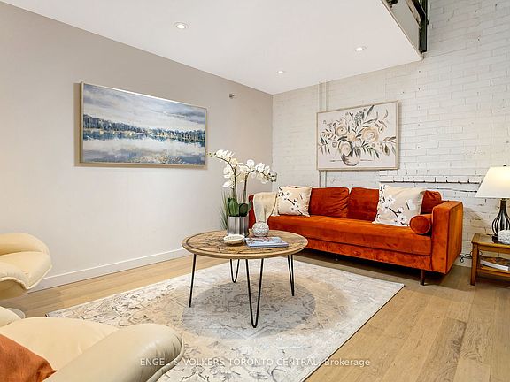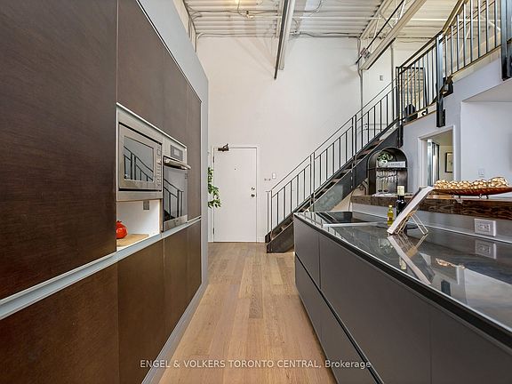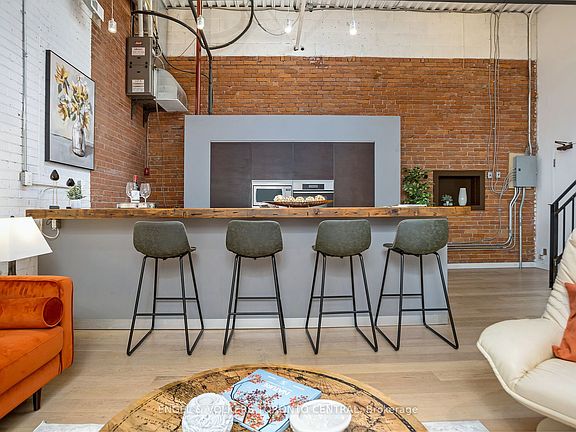 Sorauren Lofts is a former ball-bearing factory dating from 1908, which was converted into a condominium in 1997 by Brown Group. This conversion into 48 residential condo units spread over two floors has retained all of its original cachet and character.There is no doubt that you will be attracted by the unique charm and authenticity of the building with its red brick facade, and will appreciate living in a historic loft that has soul and history, which can be very personally enriching. The open-concept industrial hard loft offers an invaluable blend of vintage and contemporary design features: the 14'8" high ceiling gives unparalleled volume to the unit while the exposed brick walls provide an authentic charm. With two large motorized skylights controlled by a remote control system, you benefit from natural light. The main level has another exceptional feature that will please everyone: a state-of-the-art kitchen with a rarely seen oversized breakfast bar that provides ample storage, stainless-steel countertops, and top-of-the-line built-in appliances. Enjoy the view from the steel-framed mezzanine, large enough to accommodate your bedroom and your small office. Sorauren Lofts is truly a prime spot in a quiet residential neighbourhood where people enjoy a sense of community and a charming vibe. It is a two-minute walk from Dundas Street West and it adjoins the desirable Sorauren Park which offers a wonderful dog off-leash park, 2 tennis courts, a weekly summer farmers market, and free outdoor movies from June to September. Last but not least, discover the best of Roncesvalles Village, remarkable with its fashion boutiques, artisan food shops, restaurants, cafes, parks, and world-class public transport options. This is a unique gem that can become yours!