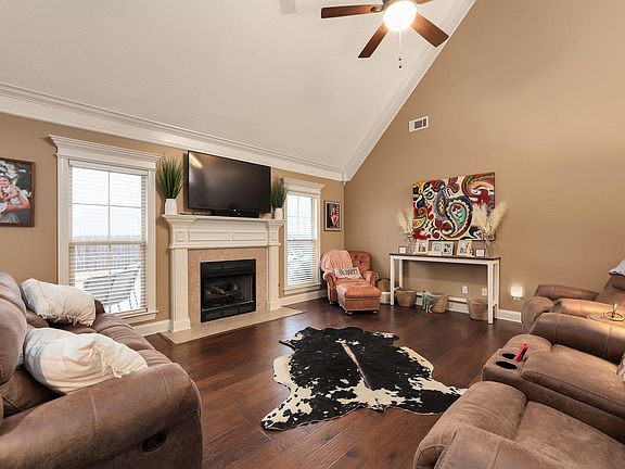 Medina home : 4 bedroom, 2.5 baths plus a 16x20 Bricked wired workshop. Interior storm shelter! 3 bedrooms up. Primary is down with whirlpool tub and large walk-in closet. Open eat-in kitchen with bar ~ All Hardwood & Tile flooring - Solid surface counters in kitchen. Formal dining room, large great room with gas fireplace, fenced backyard. 2y/o Roof In-ground saltwater pool. Move in now and get settled just in time for summer fun!