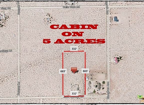 3470 BLUEGRASS, 29 PALMS - SUMMER SALE PRICE 20% OFF = $35,200.00 - This colorful 400 sq. ft. cabin in situated on 5 Acres. Chain link fence around about an acre and the cabin with a front car gate and back gate. Old survey markers appear to mark all the lot corners. Nice rancho homes nearby. Perfect for your pets such as horses, hogs and dogs. Stucco outside with several windows and doors. Inside has a wall up for one bedroom. Old electric panel might make it easy to turn on the electric. Electric in street. Water in street cost quoted to install water meter $1942.00. Easy to find with access just off a paved road. Dimensions 332 X 665 = 5 Acres. Near marine base and off road areas. Owner will carry with 20% down $7040.00 a 1st trust deed of $28,160.00 @ 7% interest amortized over 5 years payable $557.60 plus $15.00 loan service fee per month. APN#0610-161-12-0000
