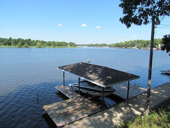 Ideally located on the main lake, this charming year-round 3 bed / 2 bath lake home features a 1st floor master, XL living room w/fireplace, dining room overlooking the lake and a 16 x 13 screened-in water-view porch. The outside is just as appealing with a 25 x 13 deck off of the screened porch, wide waterside concrete patio running the length of the low-bank waterfront, and additional decks on either side of the permanent covered boat-lift. Plenty of options to enjoy the sunsets across the lake. Further perks can be found on the backside of the property such as the large fenced yard and additional half acre lot with a 32 x 32 two-plus car garage, also great for boat storage.