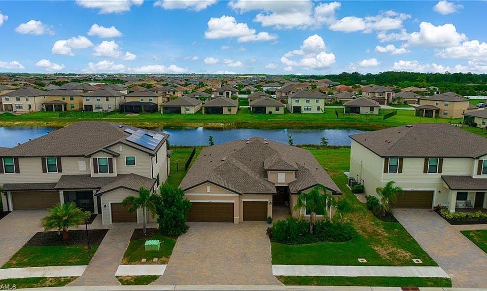 Experience luxury living at its finest in this modern, single-story Summerville II home, nestled within the gated community of Portico in Fort Myers. This open-concept home, decorated in a neutral color palette and soothing tones, offers 2,445 SQUARE FEET of living space featuring 3 BEDROOMS PLUS DEN and 3 FULL BATHROOMS, creating a harmonious blend of elegance, functionality, and comfort. Step into the bright and inviting foyer through DOUBLE GLASS INSERT FRONT DOORS that provide an abundance of natural light. The OPEN CONCEPT great room is perfect for family living and entertaining. The large kitchen is a chef's dream, featuring an OVERSIZED CENTER ISLAND with seating, gorgeous designer lighting, prep counter, ample storage, walk-in pantry, white cabinetry with 42” upper cabinets, CUSTOM DESIGNED ITALIAN MARBLE BACKSPLASH, granite countertops, and stainless-steel appliances. The living room, with its elegant TRAY CEILING, seamlessly connects with the kitchen and formal dining area. Other notable features include a 3-CAR GARAGE WITH EPOXY FLOORS, TILE FLOORING THROUGHOUT, NEW FRONT-LOAD WHIRLPOOL DUET WASHER AND DRYER, a UTILITY SINK, and a den/office with French doors. The secondary en-suite bathroom boasts a frameless sliding glass shower door, and there's additional paved patio space for outdoor enjoyment. The thoughtfully designed SPLIT FLOOR PLAN ensures privacy for each bedroom. The primary suite offers a serene retreat with a spacious, light-filled bedroom, private access to the lanai, tray ceiling, designer chandelier, TWO WALK-IN CLOSETS, and a well-appointed en-suite bathroom featuring dual counters/sinks, a separate water closet, and a massive walk-in shower. Two additional bedrooms, located at the front of the home, provide ample space and privacy for the entire family. This amazing waterfront home encompasses a generous 0.20-acre cul-de-sac lot with serene LAKE VIEWS and a screened lanai. Its east rear exposure provides stunning sunrises to complement your perfect piece of paradise. This home offers plenty of space for you to design and create your own personal outdoor pool and spa oasis. Residents of Portico enjoy resort-style amenities, including a clubhouse, community pool, fitness center, movement/exercise room, pickleball, tennis and basketball courts, and a children’s park. Pets, fences, and low-speed vehicles are permitted. With its well-appointed amenities, low HOA fees, prime location in a NO FLOOD ZONE in Fort Myers, and convenient access to shopping, dining, and entertainment, this home truly has it all. Lennar is currently sold out of 3-car garage home lots in Portico, making this a great opportunity! Don't miss the chance to make this exceptional property your new home. Schedule your private viewing today before this gem is gone!
