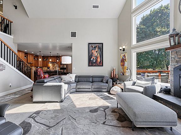 Stunning custom home on 3 acres with Row River frontage! Light filled living room with soaring vaulted ceilings and window features with peaceful views, loft office, gorgeous kitchen with custom cabinets, full tile backsplash, quartz counters and island with prep sink. Large mud room with laundry chute and extra storage; main level primary suite with deck access, walk-in closets, jetted tub, walk-in tile shower and heated floors. Upgraded HVAC system with 4 independent zones, dual hot water heaters, 320 amp electrical with 2 main house panels, and additional insulation in vaulted living room. 29x16' bonus room above insulated and air-conditioned garage/workshop. Second detached 2400 Sq Ft shop holds 10 vehicles. Flood insurance is not required.