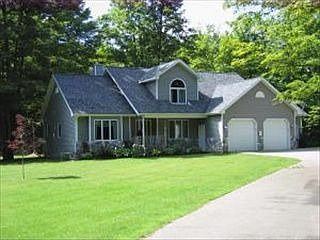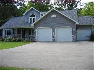 Custom-built builder's home. 9.89 acres adjacent to 280 acres of state forest-land yet only 2 mi. from Meijer. Nice set-back from road with paved asphalt drive. Large easy to maintain lawn. Ample clean storage for vehicles and toys. Home features lots of oak including floors and foyer. Smart access from garage to kitchen, laundry room, and bathroom. Luxurious master bedroom suite with large walk-in closet, jet-tub, and lots of tile. Wood burning and venting system delivers wood or propane-fired hot water through forced-air ductwork. Large sunroom, big hot-tub stays.