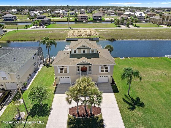 3 Story waterfront home at Hernando Beach. Ground floor has 2 separate garages, a storage room, a tool shed, and a game room with a pool table and a bathroom. Sliding glass doors lead out to the inground swimming pool and 2 boat docks, one with a boat lift to keep your boat safely out of the water. On the second floor the Kitchen has granite counters, an island and a nook with a bay window looking out over the water. Also on this floor is a laundry room with cabinets and a sink and an office, plus 2 bedrooms and a guest bath, along with a formal dining room, a great room and a large pantry. The sliding glass doors in the great room pocket back so the porch can be incorporated into the living area when the weather is nice. Laminate floors for easy maintenance. The private master suite is located on the 3rd floor and has cathedral ceilings. a large closet, a shower, and a separate jetted tub. A small sink and cabinets in the master bedroom provide for a coffee or wine area. There is a private balcony accessed by French doors overlooking the water and with a view of the Gulf of Mexico.