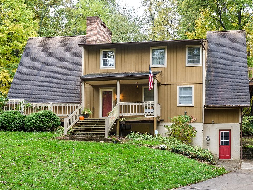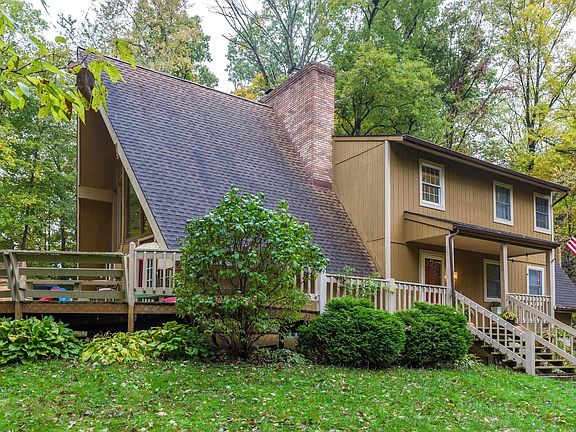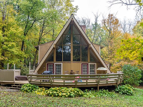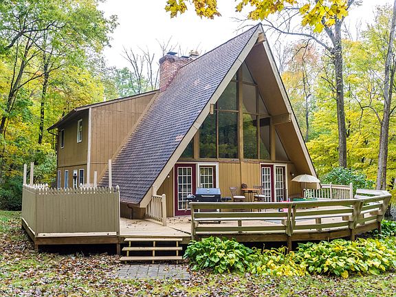 A unique opportunity to find a cabin-like home right in Beavercreek. Nestled in the woods, this rustic A frame house has plenty of privacy. Two floors of windows in the family room allow you to enjoy lots of natural sunlight and the surrounding nature. Three fireplaces make the house have a comfy feel. Oversized master bedroom with extra sitting area. Finished basement complete with media room. Don't miss this chance to make this house your home!