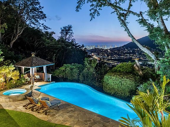 Manoa Royal Retreat is a rare 9-acre Honolulu estate where contemporary design meets lush Hawaiian mountain serenity. This three-story sanctuary sits high above the city with unobstructed views of the ocean, coastline, mountains, and sunsets. Designed by award-winning international designer Beatrice Girelli of Indidesign, its airy interiors and soaring glass ceilings blur the line between home and nature, creating a peaceful, private haven for up to 10 guests.