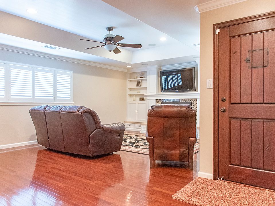 • Kitchen Island, Coffered Ceiling(s), Corian Counters, Wired for Sound, Crown Molding, Granite Counters, Remodeled, Bookcases