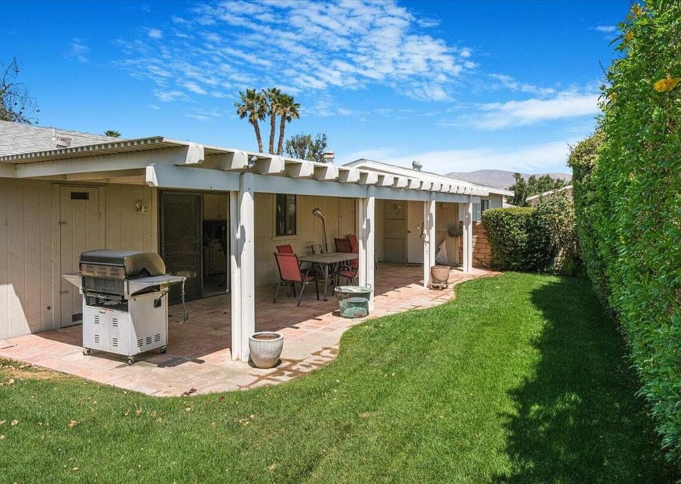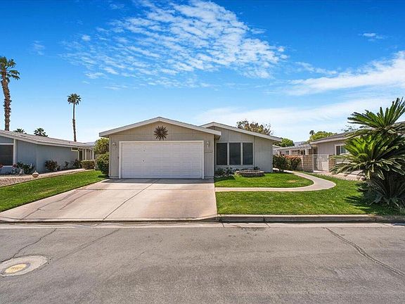YOU OWN THE LAND!! Home has an amazing fenced private covered patio and grassback yard. Ivey Ranch is a 55 and better community with a 9 hole PGA rated golf course and driving range. There 4 community pools, 2 community spas, clubhouse and tennis courts.This home has an open floor plan - living room dining room and kitchen with 2 bedrooms and 2 baths and a laundry room.Sliding glass door in the dining room takes you to a very private walled grassy back yard with tile patio with overhang for shade.Don't forget the 2 car attached garage.You own the land and the home has foundation and can be financed.House is being sold 'as is' so bring your decorating touch and create your perfect home in the desert.