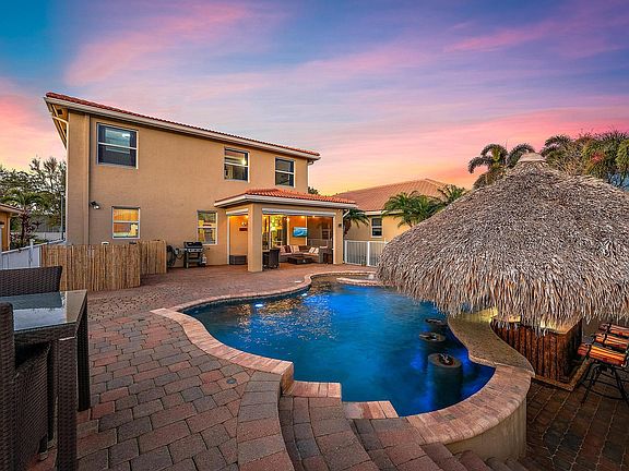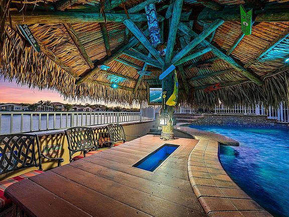 Imagine a stunning waterfront tropical oasis in Stuart, Florida. River Marina is located off the St. Lucie River with a boat ramp and ocean access. This breathtaking home sits on the lake, offering serene water views from nearly every angle of the backyard. Step outside & you'll be greeted by a resort-style saltwater pool with built-in bar. The perfect way to enjoy cocktails while keeping cool in the water. A variable-speed pump and pool heater ensure efficiency and year-round comfort. Just steps away, a newly re-thatched tiki hut provides a shaded retreat. The ideal setting to relax or entertain. The lush, meticulously landscaped grounds surround the property, with vibrant tropical vibes. This 4-bedroom CBS home, built by Lennar, features impact windows for added durability and peace of mind. Inside, you'll find newer stainless steel kitchen appliances, an upgraded water heater, and a 2020 HVAC system, ensuring modern comfort and energy efficiency, and so much more.