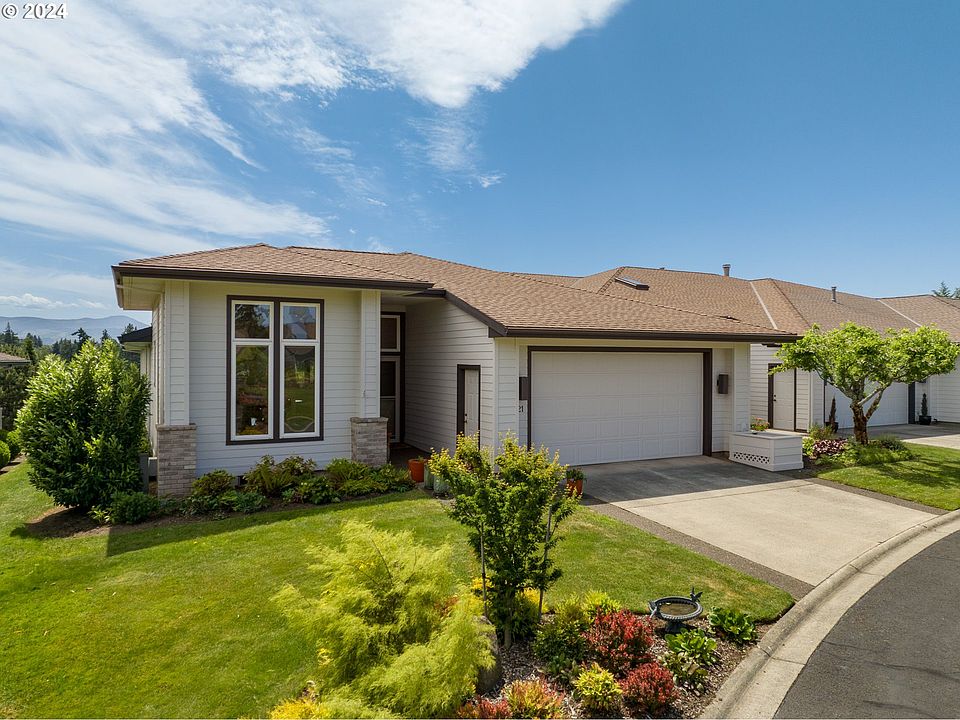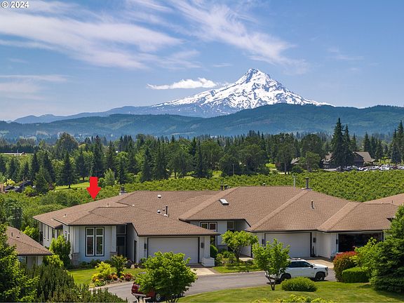 Enjoy easy living in this 55 and over community with views of Mt Hood, Indian Creek Golf Course and Hood River Valley! One level condo with double car garage. Open kitchen, granite countertops, electric built-in cooktop in large kitchen island. High ceilings, gas fireplace with built in cabinets. Office, guest bedroom, primary suite with double closets. Relax or entertain on your private covered deck while you enjoy the views.