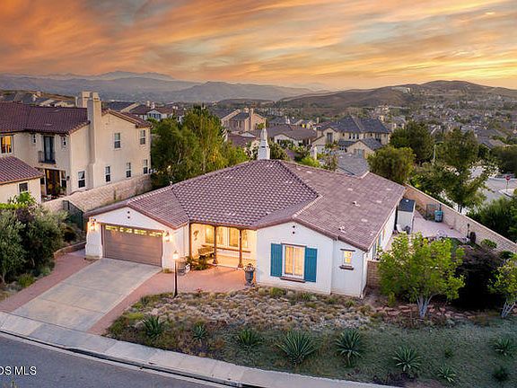 Views, Views, Exceptional Views!! Extra large elevated corner lot on a cul-d-sac in Big Sky!! Enter into massive open floor plan with Tile, hardwood & slate floors and custom wood plantation shutters on all windows. Large kitchen with wood cabinets, huge center island, granite counters and walk-in pantry. Stainless Thermador built-in refrigerator, Bosch stainless 5 burner cooktop, Double oven, Microwave and dishwasher. Family Room boasts gas fireplace and large media niche. Large master bedroom retreat W/spa like Master Bath, slate floors & Marble everywhere, counters, tub and shower. One bedroom with on suite bath and walk-in closet. Bedroom with double french doors, could be used as office, library or gym. Great curb appeal sitting high on an elevated private Lot. Large back and side yards, over 1/4 acre, with easy care landscaping featuring a large covered patio with lights and ceiling fan. Great place to entertain or sit, relax and watch the beautiful Sunsets. Still Plenty of room for a pool. Great home in The Big Sky community of Simi Valley, nestled in a valley surrounded by rolling hills under majestic Whiteface Mountain. Dog park nearby, hiking and biking trails in and around the community.
