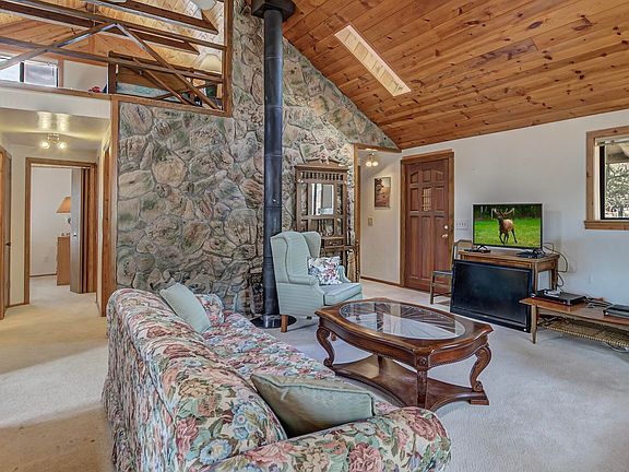 Set on a flat, usable .4-acre lot, the property features mature shade trees and a partially covered deck, where you can relax and take in the peaceful views. A separate oversized two-car garage provides ample storage for vehicles, outdoor gear, and even a workshop. The cabin and the land are the perfect combination for those wanting rustic charm on a spacious lot w/oversized garage. County Assessor does not include full finished basement in square footage.