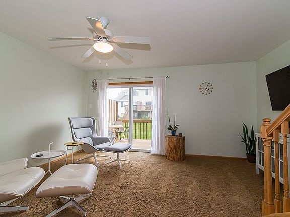 Great neighborhood, private keyless entry, bright, white kitchen, 1-stall attached garage with keyless entry, move in ready 2 story pet friendly condo is located in a family-friendly neighborhood. The main level has carpet and vinyl floors, conventional ceiling, and features all new kitchen appliances, Ring doorbell and Nest thermostat. Additionally the main level features a half bath and laundry. The kitchen features vinyl floors, laminate counters, tiled back splash and breakfast bar. All appliances stay with the home. Main level also includes a 55-inch Samsung wall-mounted TV. The master and second bedroom are located on the 2nd floor both have carpeted floors, share the full bathroom and possess spacious closets. The unfinished lower level provides room for future expansion. Outside you'll find a treated newer wood deck (2018) and porch overlooking the yard.
