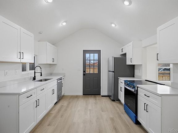 Welcome to this fully remodeled and truly adorable home, ideally located with quick and easy access to Downtown Denver. Thoughtfully updated from top to bottom, this home offers modern comfort, fresh style, and peace of mind for years to come. Inside, you’ll find new flooring, fresh paint throughout, and all-new windows that fill the space with natural light. The kitchen has been completely transformed with new cabinets, new countertops, and brand-new appliances including a refrigerator, range, dishwasher, and disposal. Updated lighting, ceiling fans, plumbing fixtures, bathroom hardware, kitchen hardware, and door hardware add a clean and cohesive look throughout the home. The improvements extend well beyond the cosmetic updates. A new furnace, new hot water heater, and new sewer line provide important long-term upgrades, along with new baseboards and doors that tie everything together. Outside, the property has been refreshed with new landscaping, tree trimming, and all-new concrete, including the driveway, walkways, and a generous rear patio, perfect for outdoor gatherings or quiet evenings. With excellent proximity to Downtown Denver and a full list of high-quality updates, this beautifully renovated home is move-in ready and waiting for its next owner. Exterior photos are AI enhanced with green grass and leafed trees. Interior photos are virtually staged.