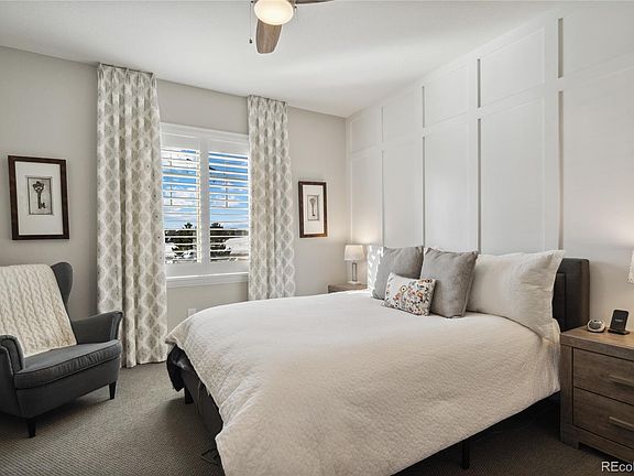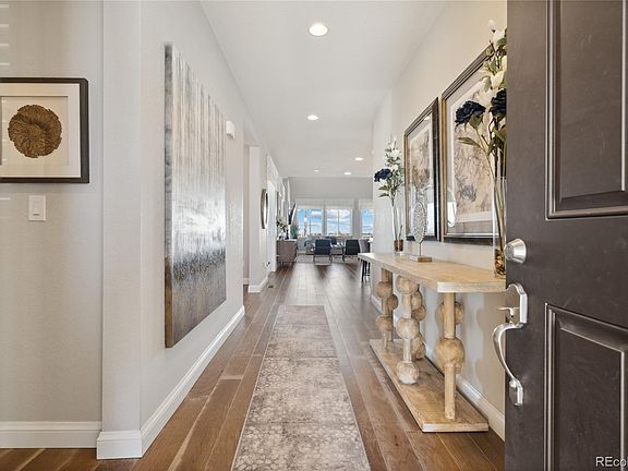 Stunning model home in Terrain exudes style & sophistication. Ideal location on a quiet cul-de-sac, over 1/3-acre lot, & backing to open space. Take in spectacular mountain views as well as natural surroundings of Castle Rock. This home is powered by owned solar panels & is equipped with EV charging station in the 3-car garage. Immaculate home that truly stands out with entirely upgraded finishes. High-end, engineered hardwood floors flow throughout the main level. Soaring ceilings & oversized windows/doors create light-filled spaces to enjoy. The kitchen invites family to gather around the oversized island & shines with quartz countertops, pristine cabinets, & KitchenAid appliances. The open, adjoining living room is anchored by a modern tiled wall & cozy fireplace. Host dinner parties in the elegant dining room featuring sliding doors that lead out to the covered, wraparound deck. A main floor primary suite is beautifully appointed with cove ceiling & luxurious private bath boasting dual vanities, soaking tub, & custom tile shower. A guest suite is located on the opposite side of the main floor. Other main floor attractions: walk-in pantry, laundry room, stylish powder room with accent wall, & mud room. Upstairs has a loft overlooking the main floor & two bedrooms with sizable full bath. Retreat downstairs to a newly finished walkout basement with 9-foot ceilings. An office or workout studio, guest bedroom with beautiful bath, & ample storage room complete the lower level. Step outside to a peaceful, landscaped backyard and covered patio. Revel in sunsets perched on your generous Trex deck. Ideal indoor-outdoor living is easy here! Terrain offers many wonderful amenities: 2 pools, clubhouse, playgrounds, trails, dog park & nearby Sage Canyon Elem School. Drive just 5 minutes to downtown CR to visit quaint coffee shops or get all your shopping done at nearby Outlets at Castle Rock. Commute just 20 minutes to DTC or 30 minutes to downtown Denver.
