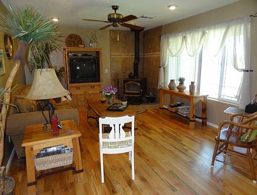 Incredible park like yard! This darling well cared for and well constructed 3 bedroom home on over 5 acres features 10 A.F.W. and is fenced and cross fenced for pasture, yard, garden area and more! 18X38 metal shop, 12X12 garden tool shed. Lovely knotty oak hardwood and tile flooring, basement is great for storage and is plumbed for bathroom. Peach, plum, apple and cherry trees. Lovely mature trees make this your garden oasis!